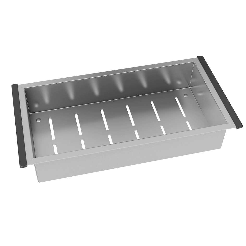 A bandeja retangular profunda pode ser utilizada para higienizar frutas, bem como acomodar utensílios após serem higienizados. Este acessório, é compatível com a coleção Quadratino sem canal. Tem profundidade de 83 mm, com aberturas na base, que permitem o escoamento da água.